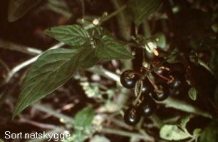 når den spises eller bruges til te. Det samme gælder nogle af de øvrige planter af natrskyggefamilien: Bukketorn (Lycium halifolium), Kartoffel (Solanum tuberosum) og Sort natskygge, men virkningen er ikke nær så stærk. Sort natskygge, Solanum nigrum, får nogle bær, der kan spises når de er helt modne, og så har de en behagelig, men ret svag virkning. De modne bær indeholder sandsynligvis atropin eller scopolamin; de umodne indeholder nogle af de samme giftstoffer som grønne kartofler, og skal derfor undgås. |