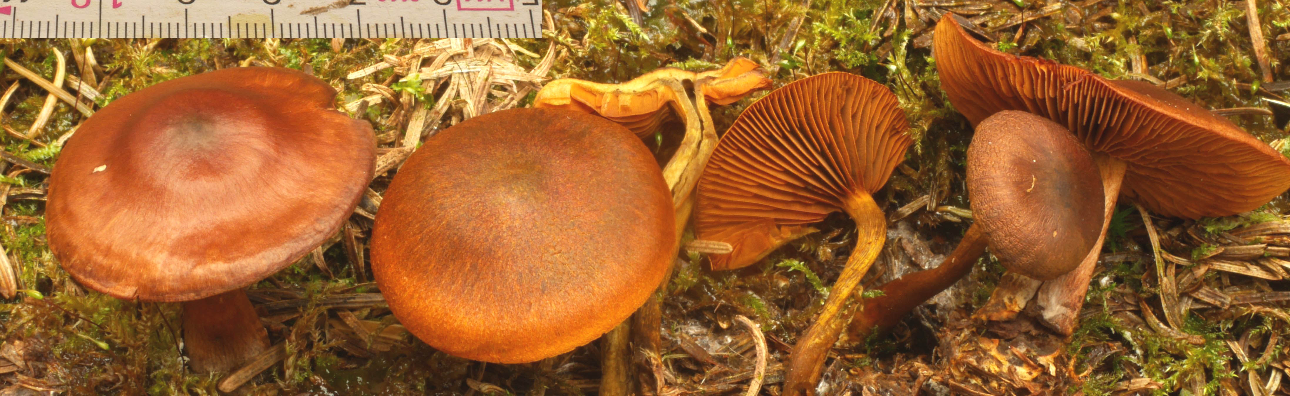 Cortinarius aurantiobasis, Safranfodet slørhat, finder: SL Findested: Gjerrild Nordstrand, Staunborgvej, 15 m vest for muldlokommet. Værtstræ: i tykt mos under birk og lidt lærk. Økologi: Ret lysåbent i naturskovspræget skov med især birk, osse lærk. |